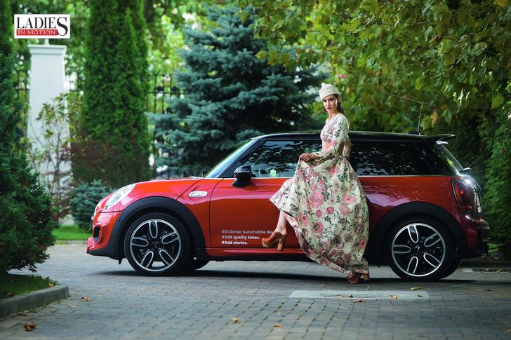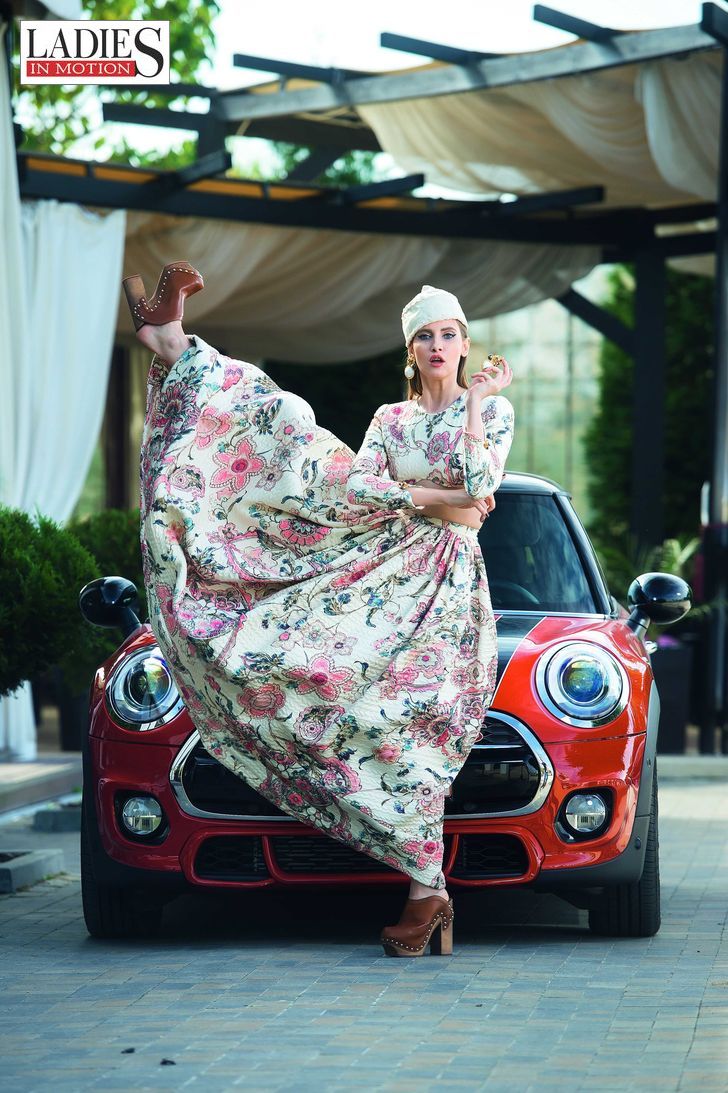 Pentru pictorialul nostru alături de cel mai puternic MINI, Iulia a ales să poarte o creație proprie, croită din materiale fine într-un mod exuberant, dar nelipsit de eleganță. La această ținută Iulia a preferat platforme. Este tipul de încălțăminte care poate crea dificultăți pentru șofat. Știind că voi primi un răspuns fără jalonări din partea Iuliei, am întrebat-o dacă nu ar fi util ca femeile să țină în mașina proprie o pereche de încălțăminte comodă. Sincer, după o seară de gală petrecută pe pantofi cu tocuri, nu este mai plăcut și reconfortant să porți o încălțăminte lejeră când trebuie să conduci înapoi spre casă? Mai presus de atât este și o decizie responsabilă față de siguranța șofatului. Recunosc că mă așteptam ca Iulia să subscrie la recomandarea mea, însă am avut surpriza plăcută de a afla că ea chiar obișnuiește să aibă în mașină o pereche de încălțăminte comodă, rezervată tocmai pentru condus. I se pare foarte firesc acest lucru.